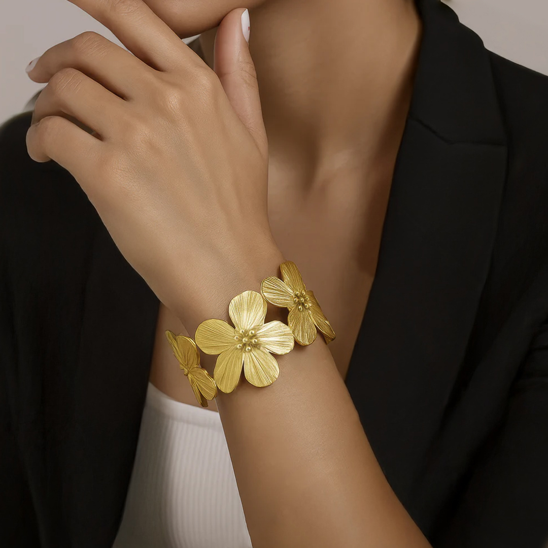 The ALRO Lily Flower Bracelet is a delicate and enchanting tribute to nature’s grace, adorned with intricate lily blossom patterns symbolizing rebirth, love, and purity. Each petal is meticulously crafted to capture the organic flow and beauty of a budding flower, making it an ideal accessory for both special occasions and daily wear. The lightweight design ensures all-day comfort, while a sturdy clasp keeps it securely in place. Whether enhancing a festive ensemble or adding sophistication to everyday attire, this bracelet offers a subtle yet striking floral charm. Perfect as a thoughtful gift or a delightful personal indulgence, it effortlessly elevates any look with timeless refinement.